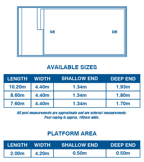 The Sunseeker fibreglass pool range is built for family-friendly performance and modern style. With a generous width of 4.4 m, each Sunseeker design incorporates a full-length entry step, a large splash deck for lounging or kids’ play, and recessed steps that maintain an uninterrupted swim zone. Both shallow and deep end areas are featured, plus a safety ledge for young swimmers, non-slip benches and steps and smooth, safe edges. Available in multiple lengths (for example 7.6 m, 8.6 m, 10.2 m) the Sunseeker is designed to meet the diverse needs of the entire family.